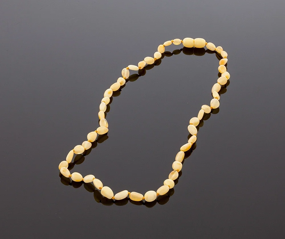 Adult amber necklace is made of white olive/bean amber beads. Freeform amber beads perfectly combine with each other. There is a knot between each olive bead.