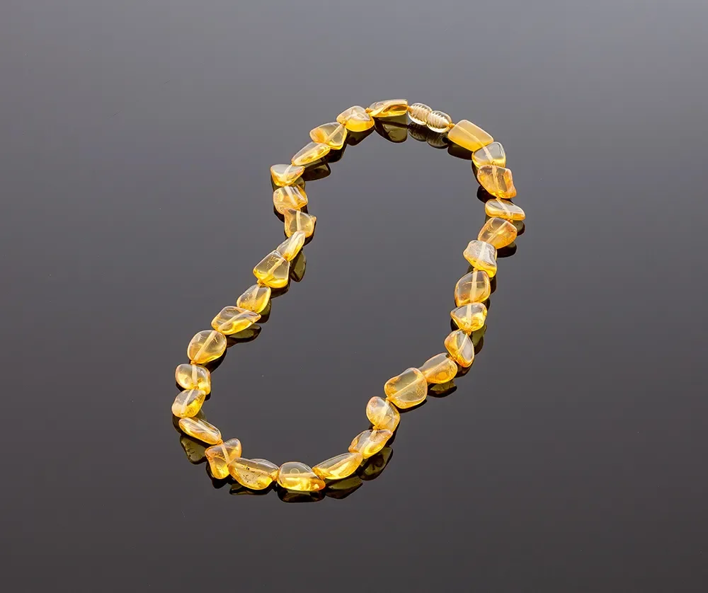 Adult amber necklace is made of flat lemon-colored olive amber beads. Freeform parts perfectly combine with each other. There is a knot between each bead.