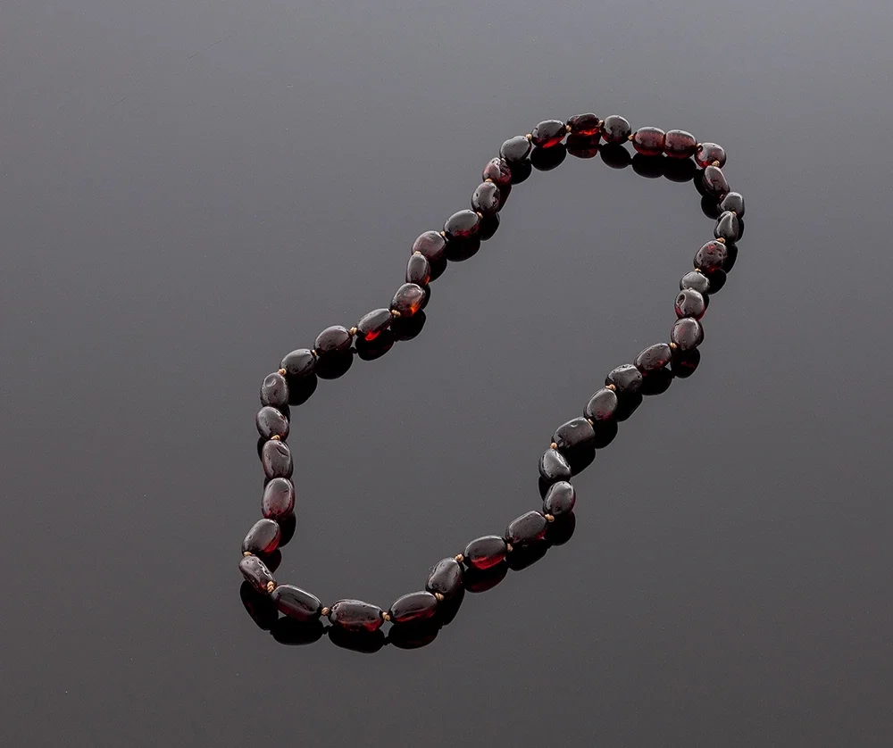 Adult amber necklace is made of cherry-colored olive/bean amber beands. Freeform amber beads perfectly combine with each other. There is a knot between each olive bead.