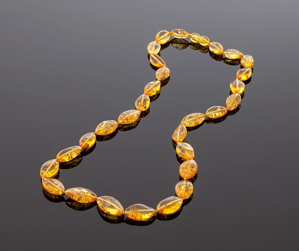 The unique and amazing property of natural amber is that it offers a natural relief of pain. There is a knot between each amber bead.