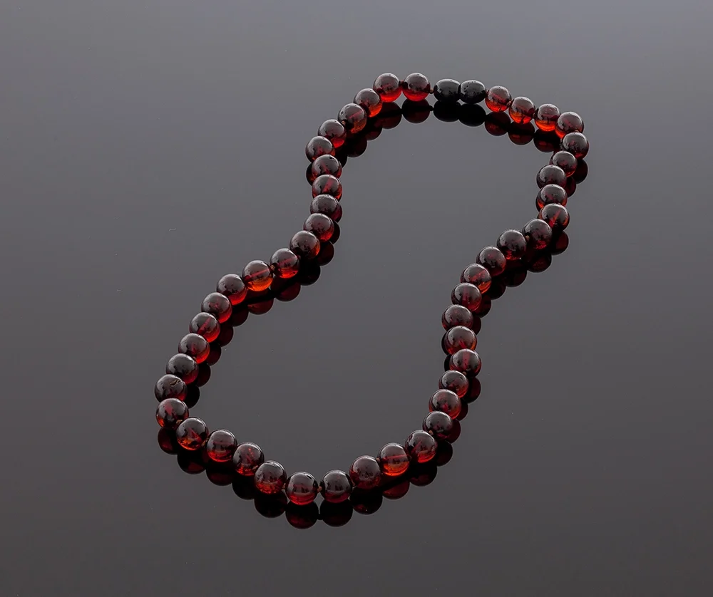 Luxury amber necklace is made of round shape amber beads. Cherry amber beads are made from natural high quality Baltic amber. Carefully polished and softly round Baltic amber beads lay comfortably against the skin. This allows maximum skin contact and gives added comfort to you. These wonderful cherry amber beads containing solar energy and the sunrise light manifest the valuable and important properties of this organic mineral. The exclusive design is suitable for different styles. There is a knot between each amber bead.