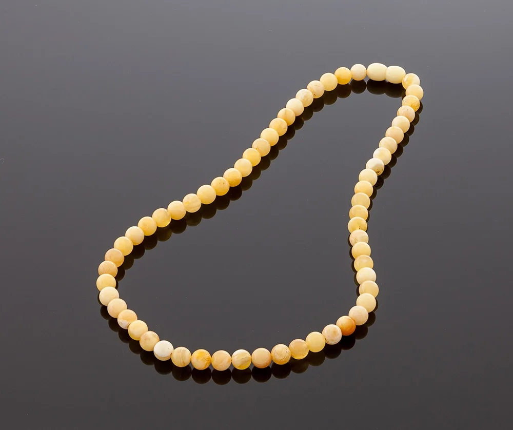 Luxury amber necklace is made of round shape amber beads. Milky amber beads are made from natural Baltic amber. Black spots and yellow color perfectly combine with each other. Carefully polished and softly round Baltic amber beads lay comfortably against the skin. This allows maximum skin contact and gives added comfort to you. These wonderful milky amber beads containing solar energy and the sunrise light manifest the valuable and important properties of this organic mineral. The exclusive design is suitable for different styles. There is no knot between each amber bead.