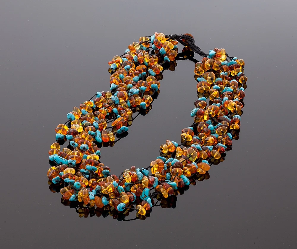 Prabangūs gintaro karoliai yra pagaminti iš natūralių Baltijos gintaro detalių ir turkio. Gintaro medaus ir konjako spalvos puikiai dera su natūraliu turkiu.
