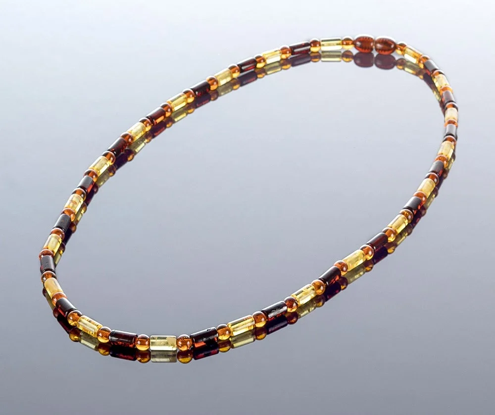 Spalvingi šviesaus, rusvo bei tamsaus gintaro karoliai yra pagaminti iš kruopščiai sukomponuotų rutuliukų ir cilindrų formos gintariukų. Tikslios detalės atskleidžia nepriekaištingą gintaro apdirbimą. Kiekviena nušlifuota ir poliruota detalė suteikia elegancijos jausmą. Patogūs, lengvi ir puošnūs Baltijos gintaro karoliai, kurie spinduliuoja energija ir ramybe tiems, kurie juos dėvi. Būtent šis gintaro apdirbimo būdas suteikia gintarui nuostabų spindėjimą. Todėl gintaro papuošalas atrodo unikaliai ir prabangiai. Tarp kiekvienos gintaro detalės nėra mazgelio. Tinkami nešioti ir vyrams.