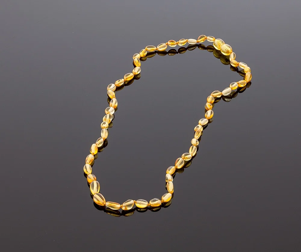 Baltijos gintaro karoliai, pagaminti iš skaidrios spalvos slyvučių formos gintaro detalių. Laisvos formos pupelės puikiai dera tarpusavyje. Tarp kiekvienos gintaro detalės yra mazgelis.
