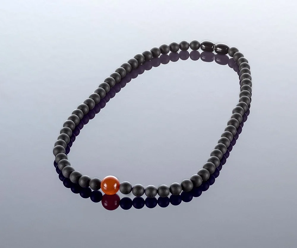 Juodojo gintaro karoliai yra pagaminta iš 100% Baltijos gintaro nepoliruotų rutuliukų. Juodojo gintaro apvalūs rutuliukai yra presuoti. Kruopščiai suverti 6 mm dydžio juodi rutuliukai puikiai dera su rudo gintaro rutuliuku viduryje, kuris yra poliruotas ir nepresuotas. Ši žavinga spalvų kompozicija puikiai dera tarpusavyje. Užsegimas pagamintas iš gintaro pakaitalo.