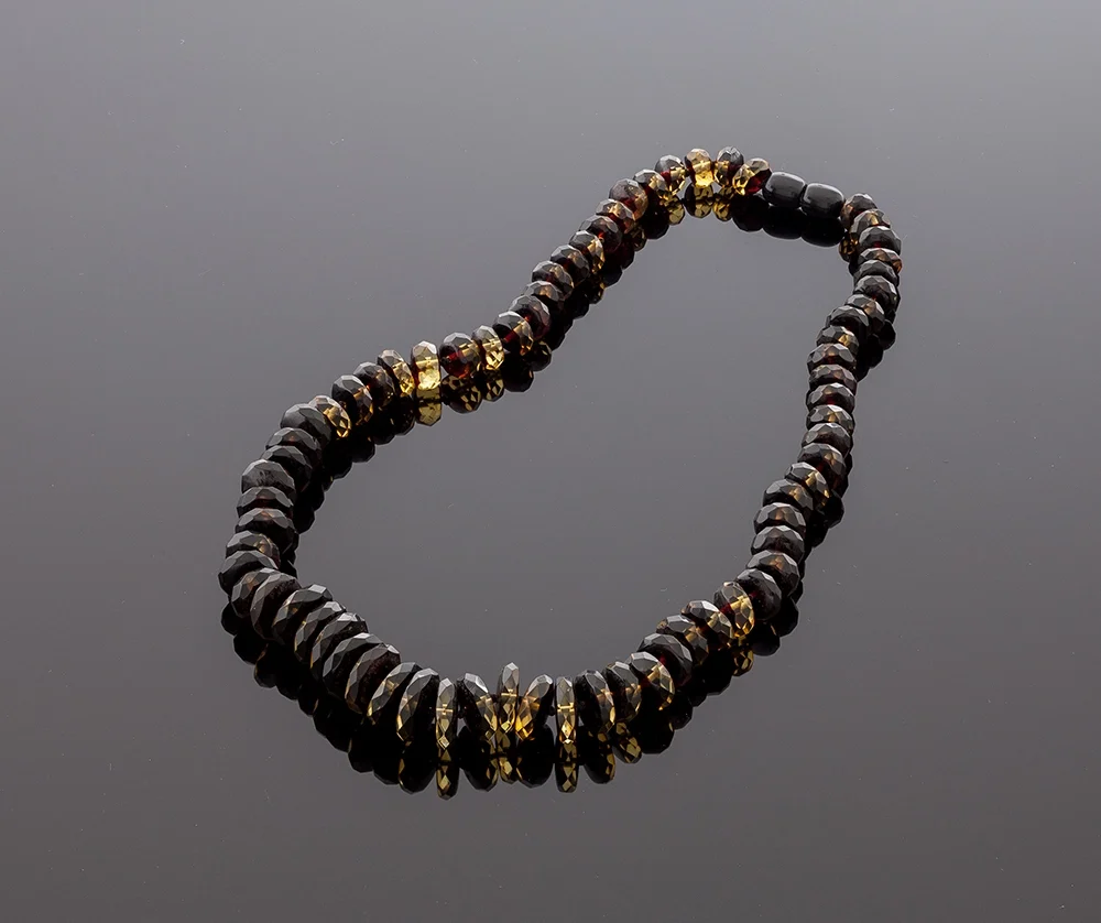 Išskirtiniai deimantinio šlifavimo karoliai yra pagaminta iš facetuotų rankų darbo tablečių. Kiekviena nušlifuota it deimantas detalė suteikia Damai prabangos jausmą. Patogūs ir puošnūs Baltijos gintaro karoliai, kurie spinduliuoja energija ir ramybe tiems, kurie juos dėvi. Būtent šis gintaro apdirbimo būdas suteikia juodai žalsvą atspalvį. Todėl gintaro papuošalas atrodo unikaliai ir prabangiai. Puikiai dera su tos pačios rūšies gintarine apyranke. Tarp kiekvienos gintaro detalės yra mazgelis.