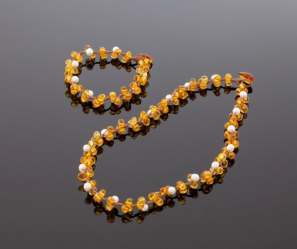 Rankomis kruopščiai pintas deimantinio šlifavimo gintaro vėrinys su natūraliais perlais. Medaus spalvos gintarėliai yra tobulai surikiuoti ir apipinti. Kiekviena nušlifuota it deimantas detalė suteikia Damai prabangos jausmą. Patogūs, lengvi ir labai puošnūs Baltijos gintaro karoliai, kurie spinduliuoja energija ir ramybe tiems, kurie juos dėvi. Būtent šis gintaro apdirbimo būdas suteikia gintarui nuostabų spindėjimą. Todėl gintaro papuošalas atrodo unikaliai ir prabangiai. Puikiai dera su tos pačios rūšies gintarine apyranke.